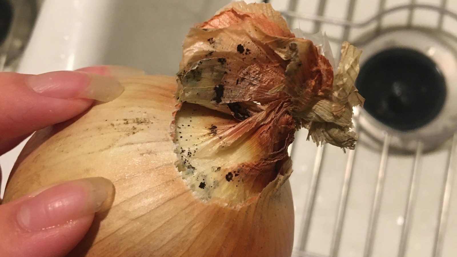 The infection usually begins at the onion’s neck, roots, or between layers, showing up as black, powdery spots. While they may appear superficial, the fungal spores can spread internally, making the onion unsafe to consume.