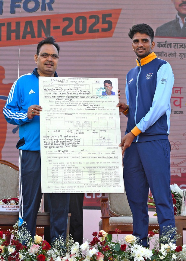 CM Bhajan Lal Sharma felicitated the gold medal winners in the National Games held in Uttarakhand and distributed land allotment pattas to 9 players. Parliamentary Affairs Minister Shri Jogaram Patel, Principal Secretary (Revenue) Shri Dinesh Kumar, Secretary (Sports & Youth Affairs) Shri Neeraj K. Pawan, General Officer Commanding 61 Sub Area Major General Rohit Mehrotra, sportspersons, school students and a large number of general public were present on the occasion.