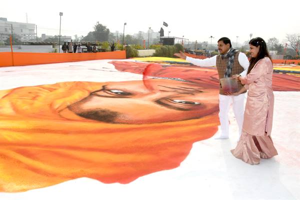 CM Mohan Yadav : 3D rangoli on Swami Vivekananda made with natural colours in 18 thousand sq. ft area at Shaurya Smarak