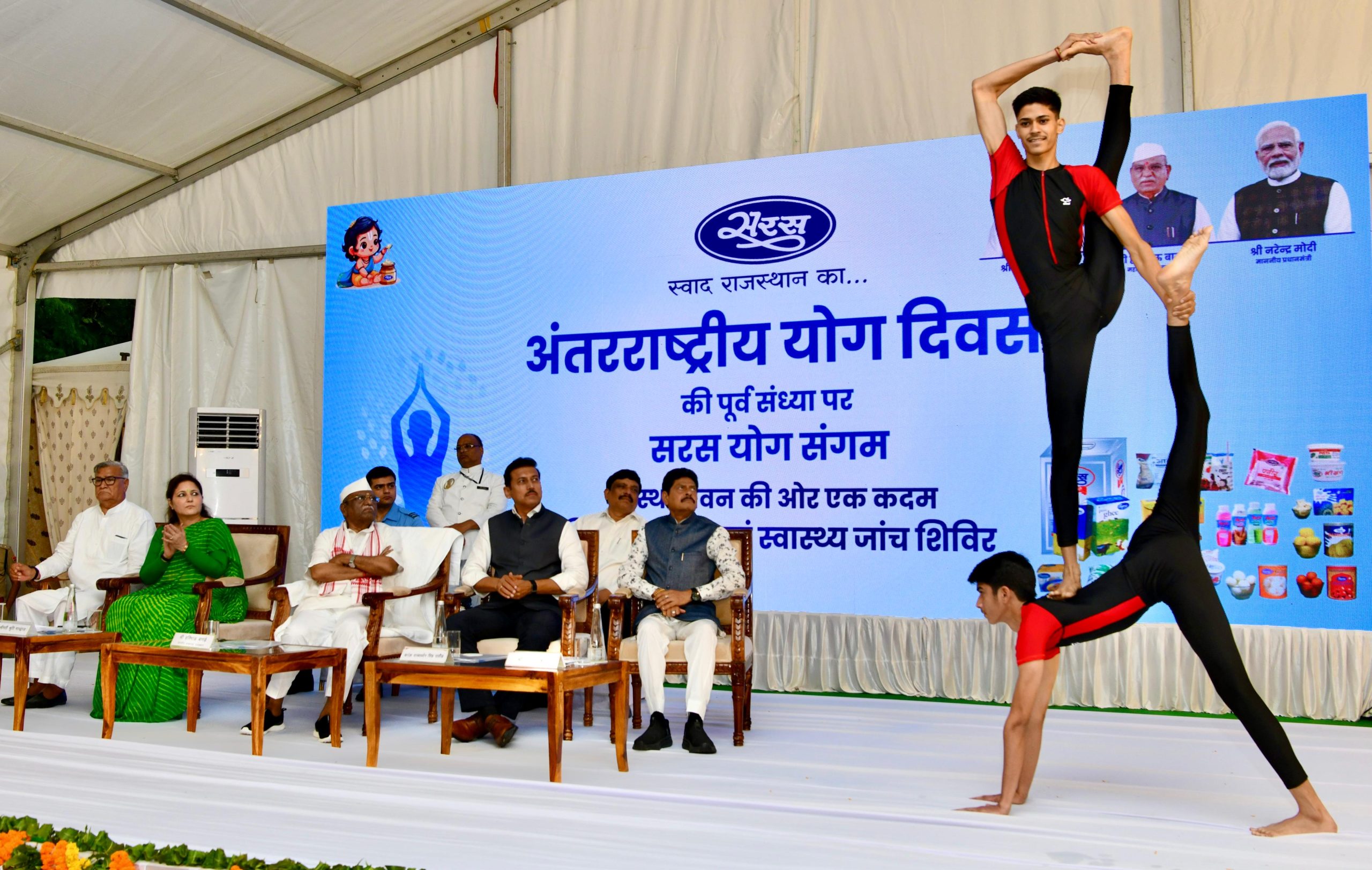 At the outset, Smt. Shruti Bhardwaj, Managing Director, in her welcome address, briefed about the activities of SARAS and the work being done for Yoga culture. Saras Dairy Chairman Om Prakash Punia was also present on the occasion. Earlier, Tanmay Singh Rao and Ankush demonstrated rare yoga postures. People also performed mass yoga, exercise under the leadership of Dr. Mahendra Singh Rao.