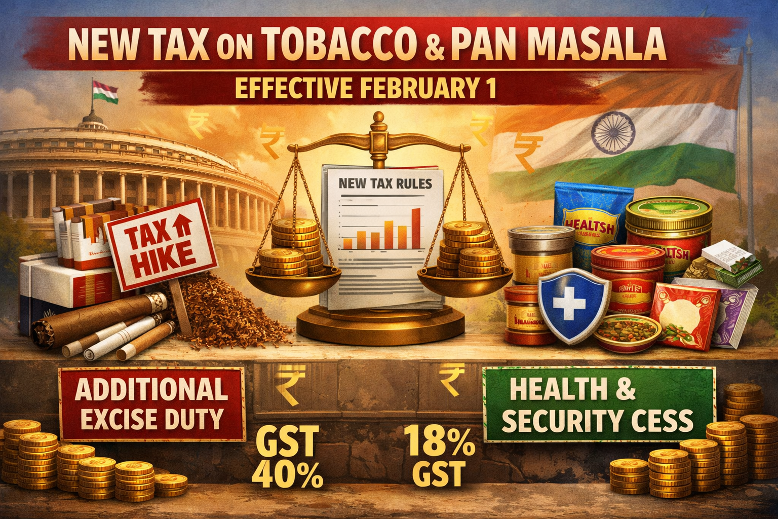 With the latest notification, the government has confirmed that the new tax structure will come into force on February 1. At the same time, the GST compensation cess—currently imposed at varying rates across tobacco and pan masala products—will be discontinued from that date.