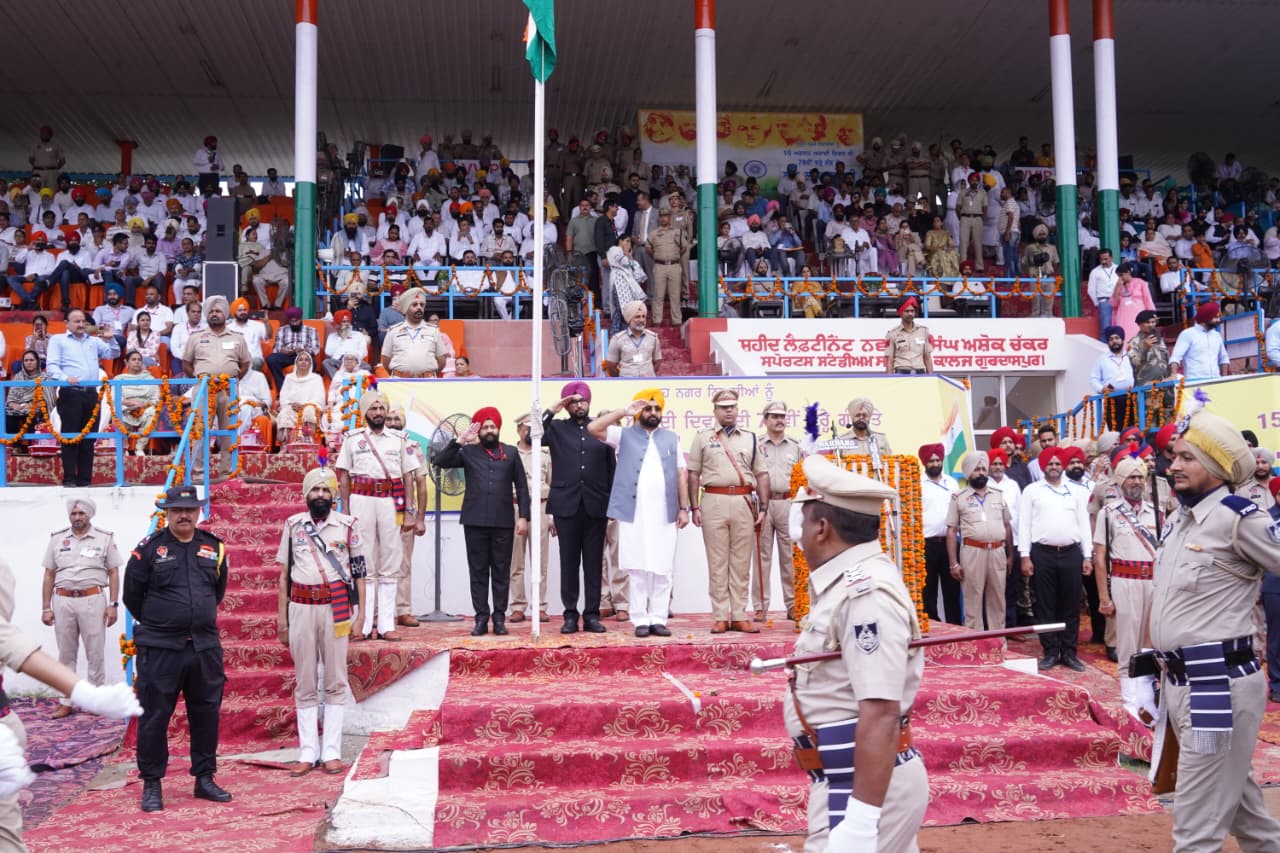 The 79th Independence Day was celebrated with great fervour at the Shaheed Lieutenant Navdeep Singh (Ashok Chakra) Stadium of Government College, Gurdaspur, where Revenue, Rehabilitation and Disaster Management, Water Supply and Sanitation, Housing and Urban Development Minister Hardeep Singh Mundian unfurled the National Flag. Before the ceremony, the Cabinet Minister paid floral tributes at the statue of Shaheed Lieutenant Navdeep Singh and at the martyrs’ gallery in the stadium.
