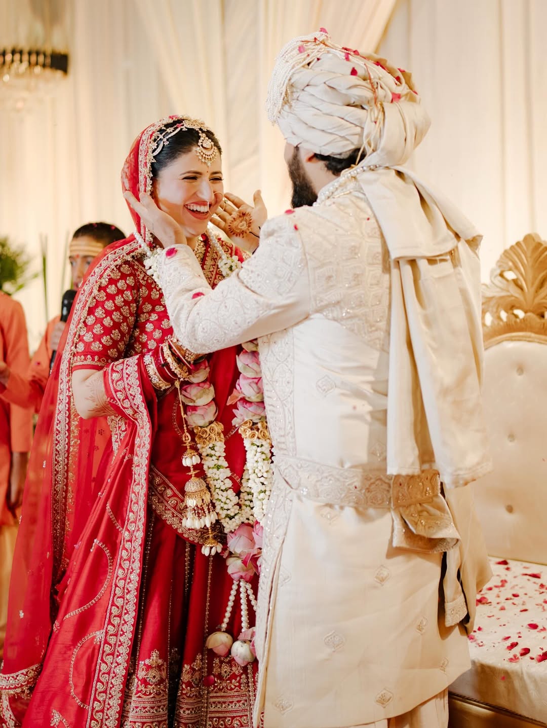 Shreya looked stunning in a red lehenga, while Kalam wore an ivory sherwani.